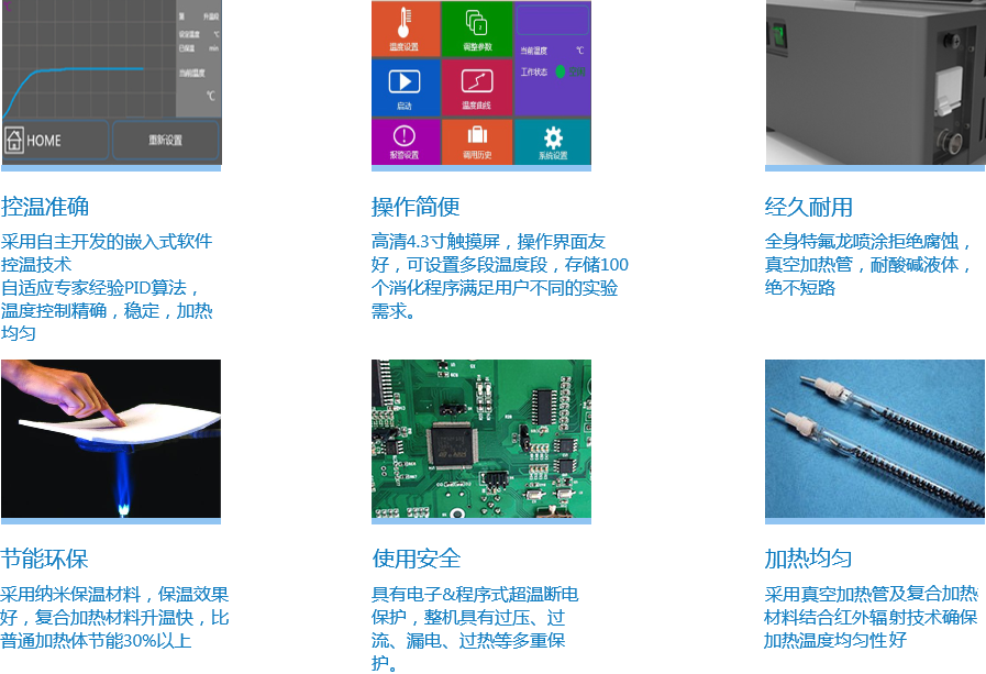 XTG5200紅外消解儀采用電熱絲復(fù)合真空加熱技術(shù),升溫效率高,溫度均勻性好。采用行業(yè)領(lǐng)先的納米云隔熱材料,熱效率高,節(jié)能環(huán)保。更具有4.3寸高清LCD觸摸屏操控界面,簡(jiǎn)單易懂,并具實(shí)時(shí)顯示溫度曲線功能,摒棄了以往溫控表頭繁瑣的操作。